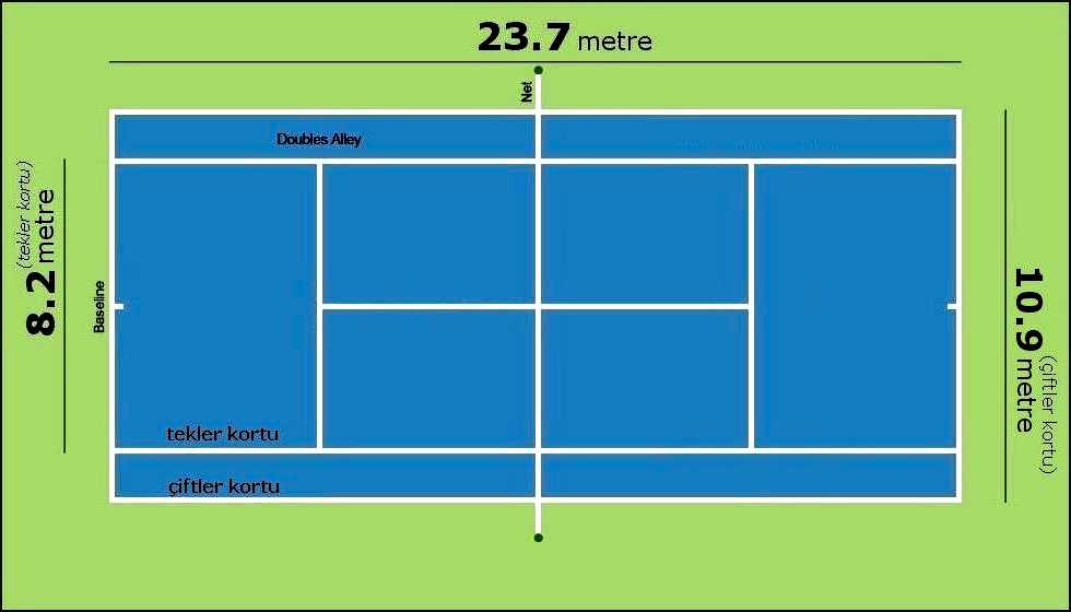 Tenis kortu 23.77 metre uzunluğunda ve 8.23 metre genişliğinde, dikdörtgen şeklindedir. Saha, ortadan boydan boya bir ağ ile ikiye bölünür. Ağ çapı en fazla 0.8 cm. ( 1/3 inç) olan bir ip veya metal kabloya asılır ve iki ucu, kenarları 15cm. (6 inç) geçmeyecek kare şeklinde veya 15 cm. (6 inç) çapında yuvarlak iki direğe bağlanır veya tepelerinden geçirilir. Direklerin yüksekliği, ip veya metal kablonun üst noktasından 2.5 cm. (1 inç) den fazla olmamalıdır.