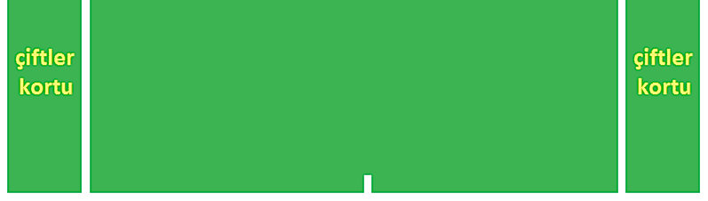 Sahanın sağında ve solundaki çizgiler çiftler kortudur. Eğer ikiye iki double maç yapıyorsanız yandaki çizgiler de oyuna dahildir. Tekseniz, en dıştaki çiftler kortu çizgileri out sayılacaktır. Örnek olsun diye aşağıdaki çiftler maçı videosuna bakabilirsiniz. Teke tek olsalardı yan çizgiler dahil olmayacaktı!