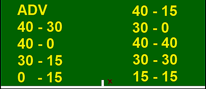 Çarpı ile gösterdiğim yerden, çentiğin sağından ilk servis atılır ve oyun başlar. Servis atanın sayısı önce söylenir. Dolayısıyla ilk sayıdan sonra servisi atan puan kaybettiyse 0 – 15, kazandıysa 15 – 0 olur…